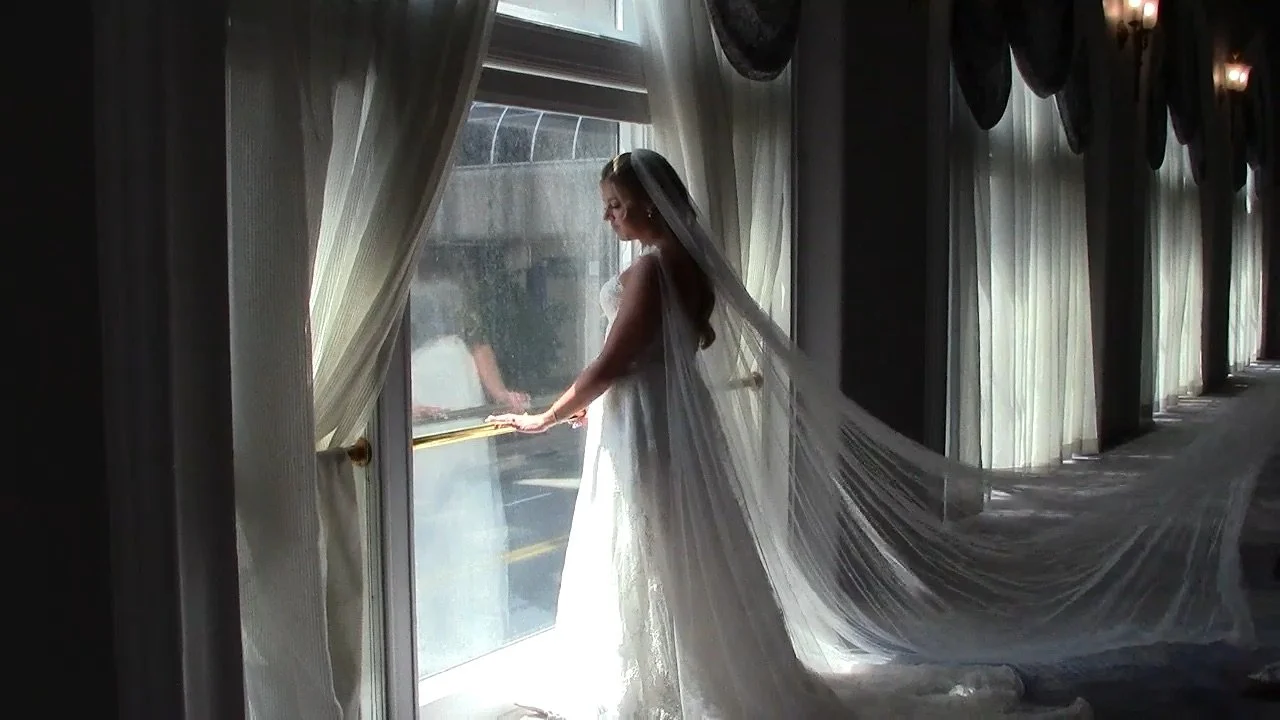 The gown’s train cascades dramatically as the bride stands in front of sheer curtains, bathed in soft light.