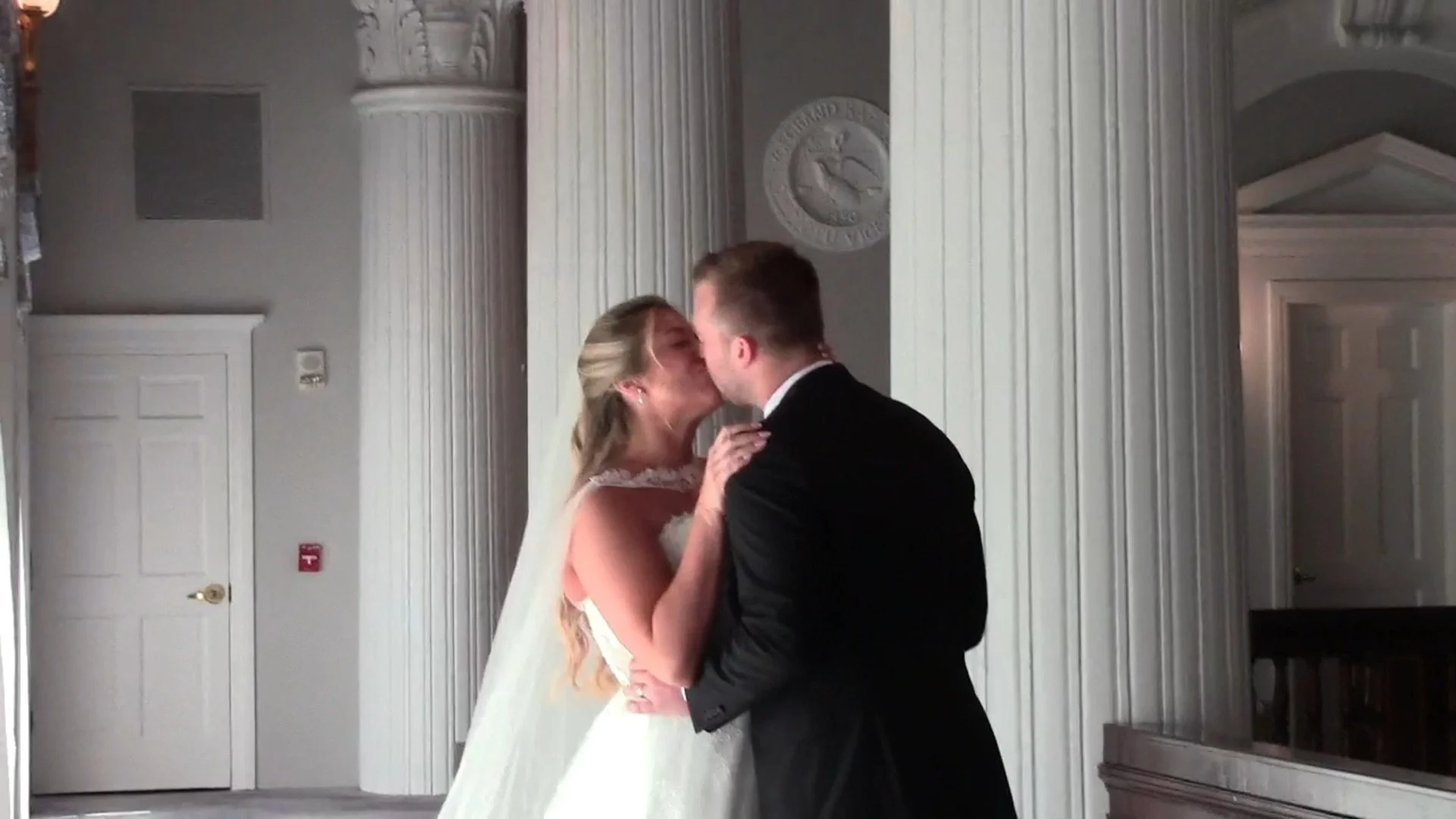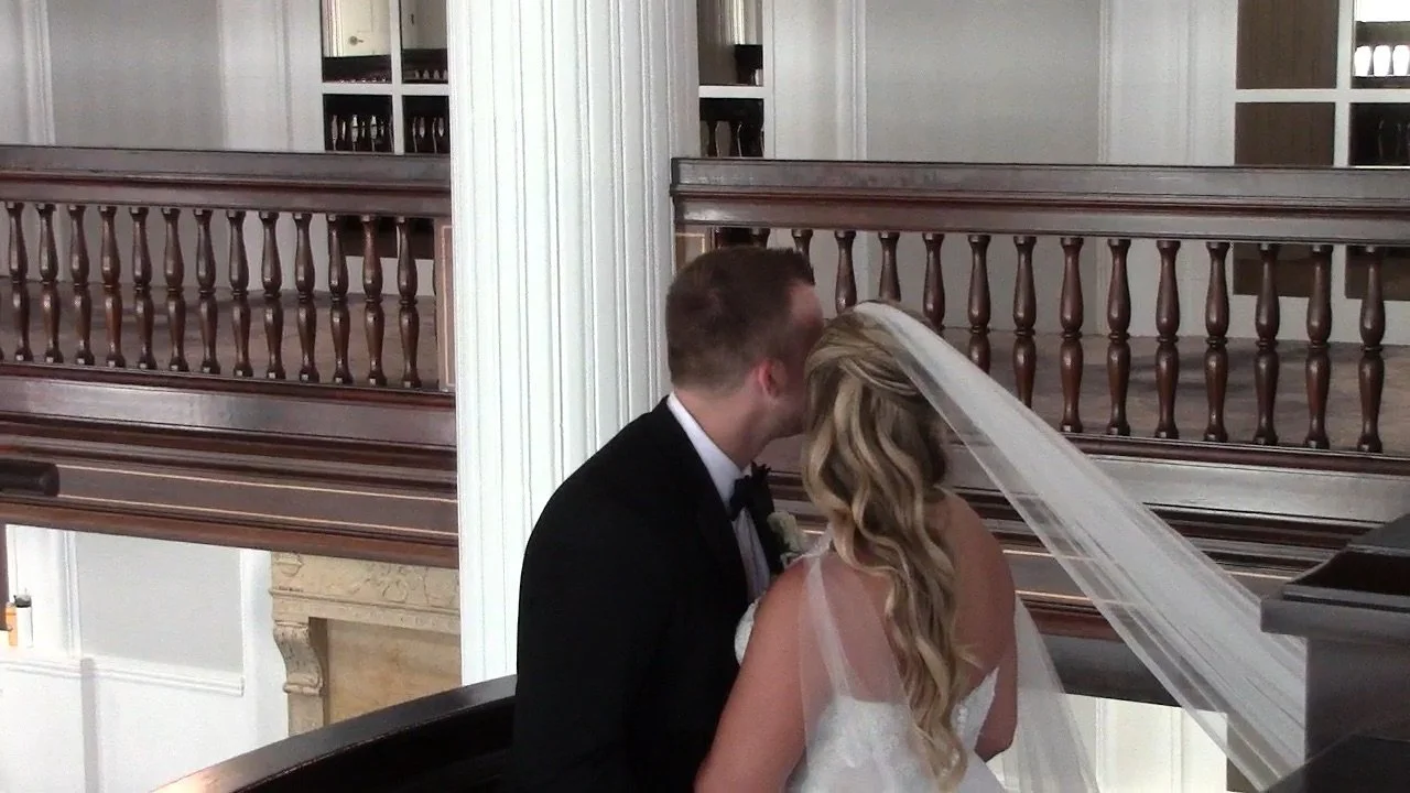The couple shares a kiss on a grand staircase, filmed in true camcorder style.