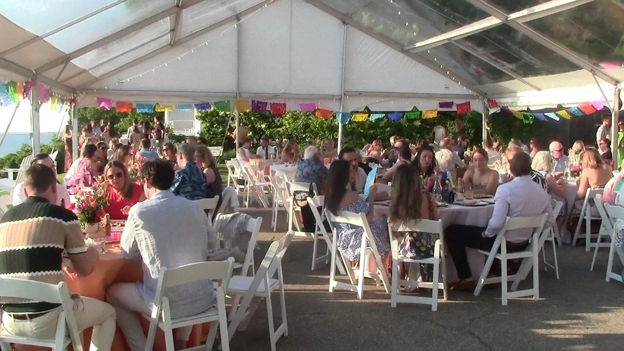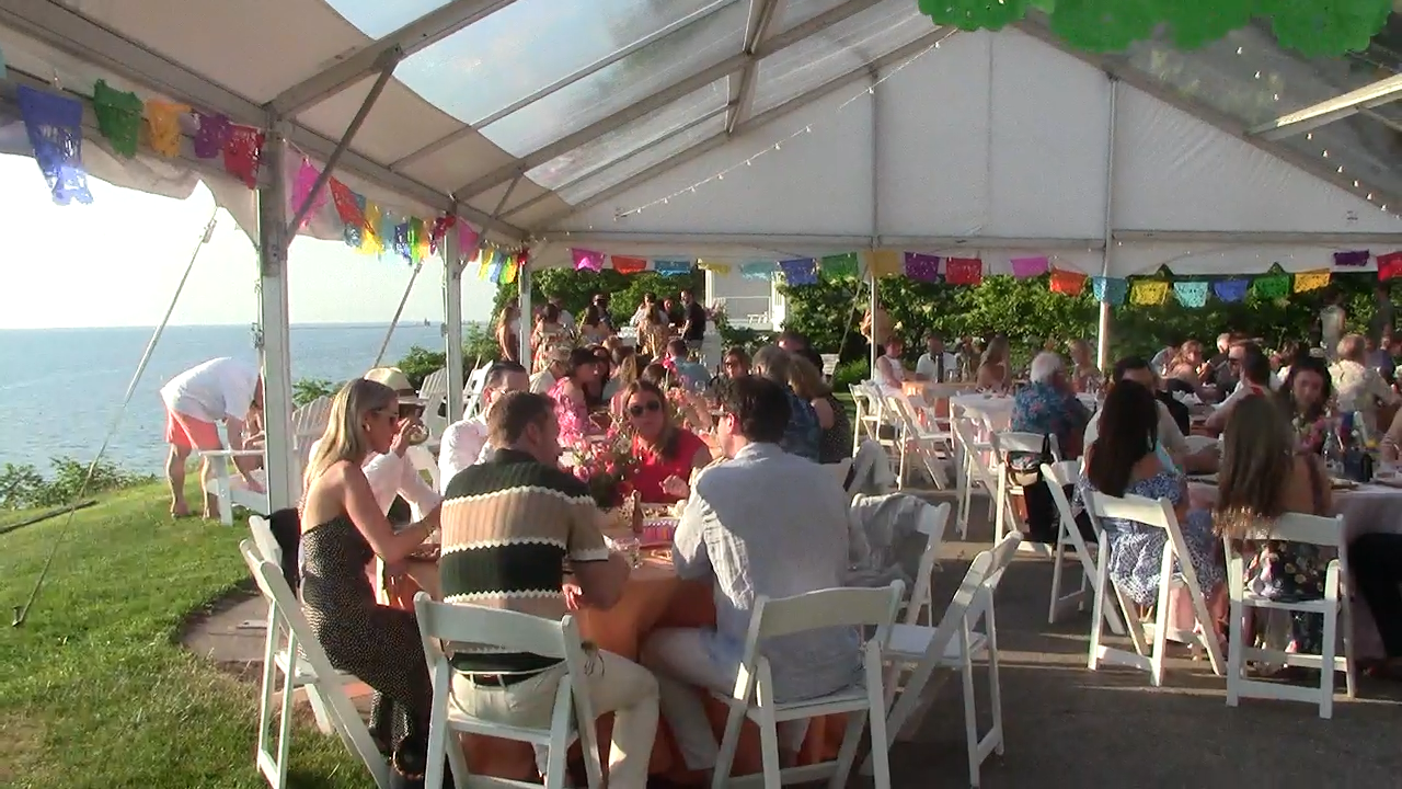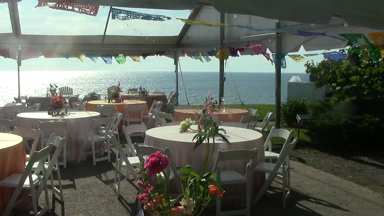 Guests enjoying a colorful outdoor reception under a tent, filmed in classic camcorder aesthetic.