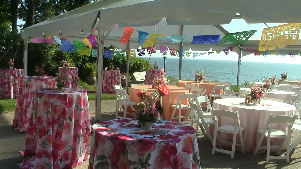 Bright, floral linens and vibrant décor set the tone for a lively outdoor celebration overlooking the water.