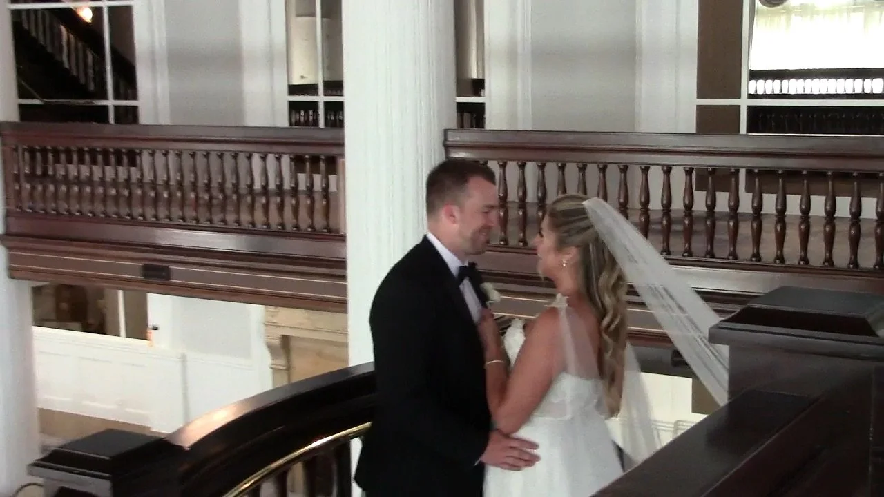 A cinematic shot of the couple standing on a sweeping staircase framed by arched windows and soft natural light.