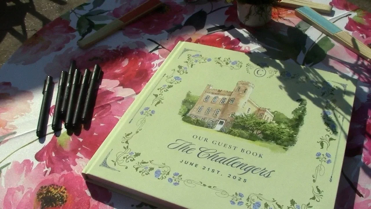 Close-up of the wedding program and pens, adding a nostalgic documentary feel.