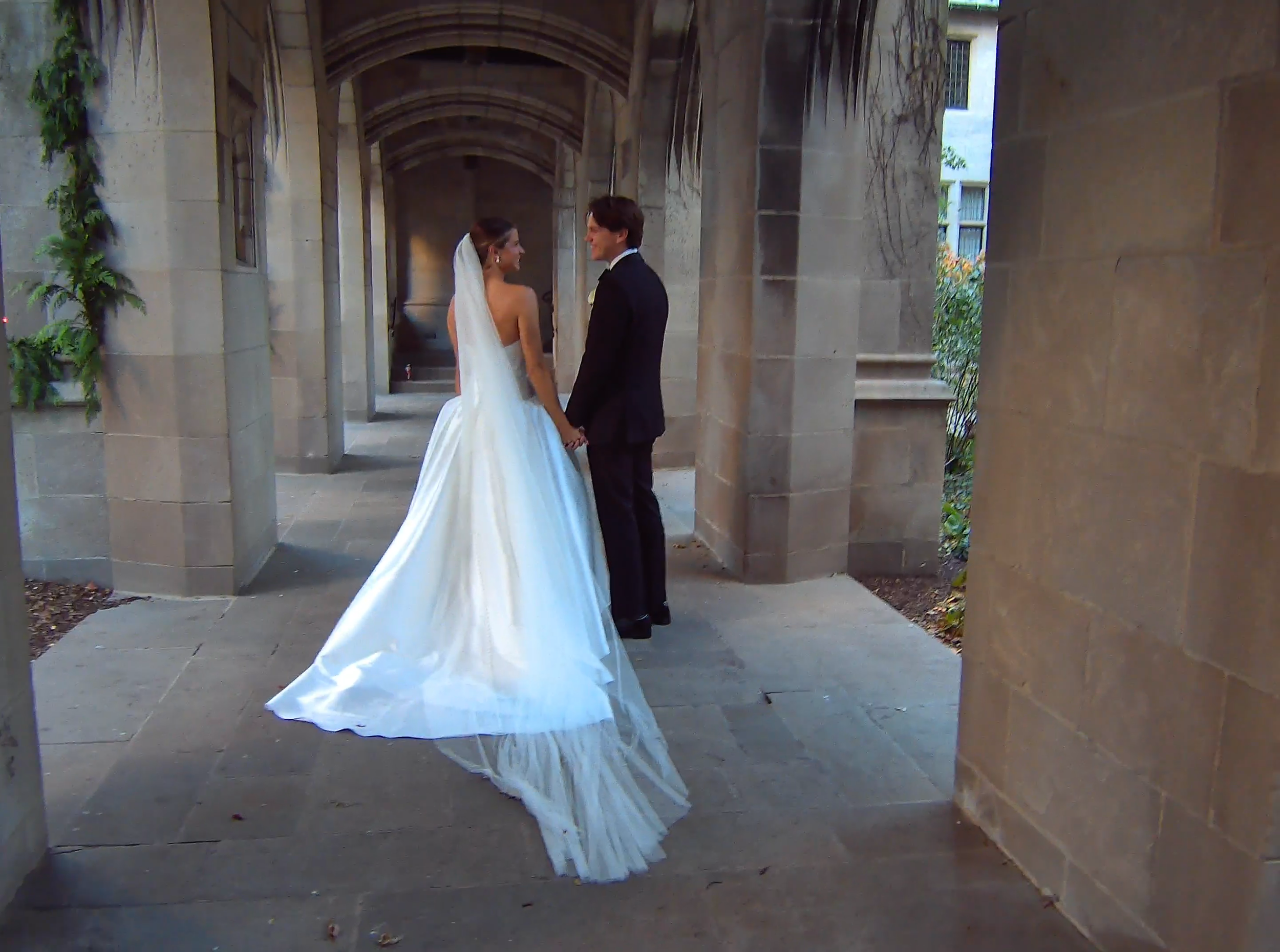 Grace and Jack pause beneath the vaulted archways, creating a classic Chicago wedding portrait.