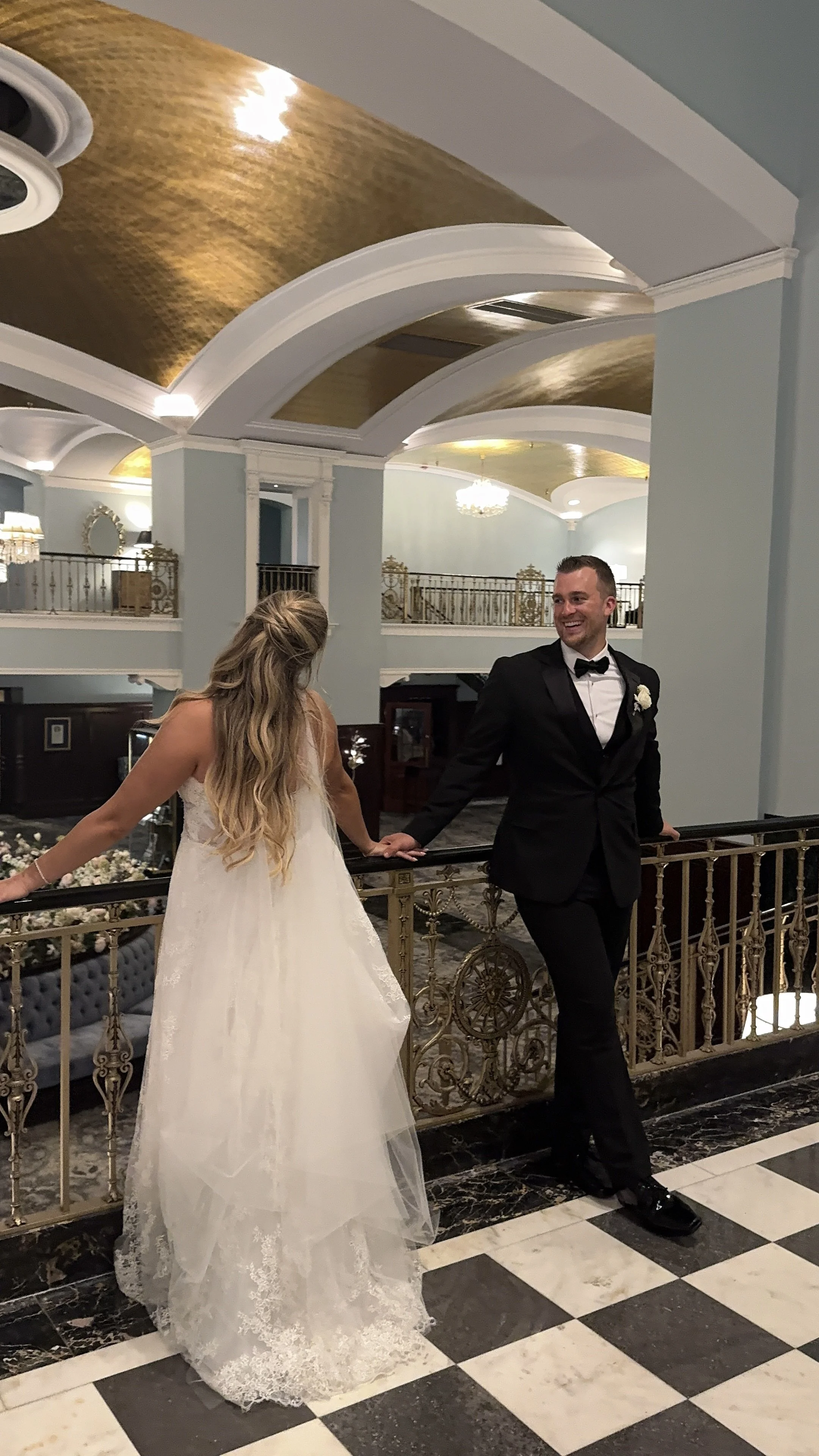 • Bride and groom holding hands in elegant wedding reception area with ornate railing and high ceiling.